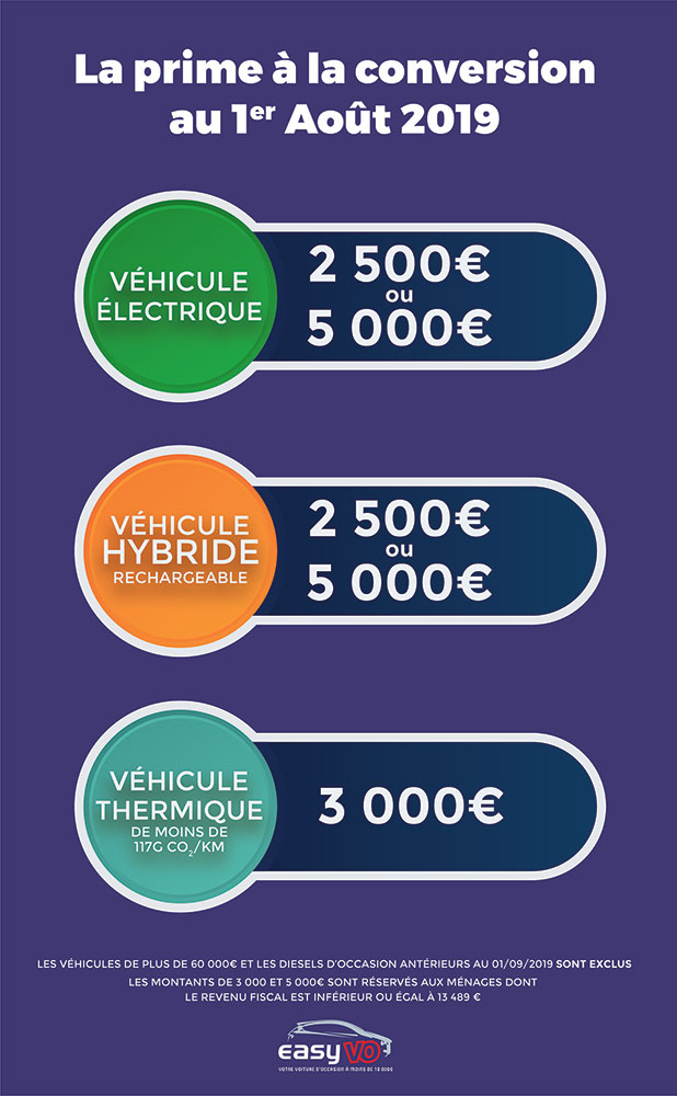 Pour bénéficier de cette prime, vous devez également mettre à la casse une ancienne voiture. Mais les conditions d'obtention sont. Voiture d'occasion électrique ou hybride rechargeable dont l'autonomie est supérieure à 50 km et l'émission de co2 inférieure à 50g co2/km Comment bénéficier de la prime à la conversion ?